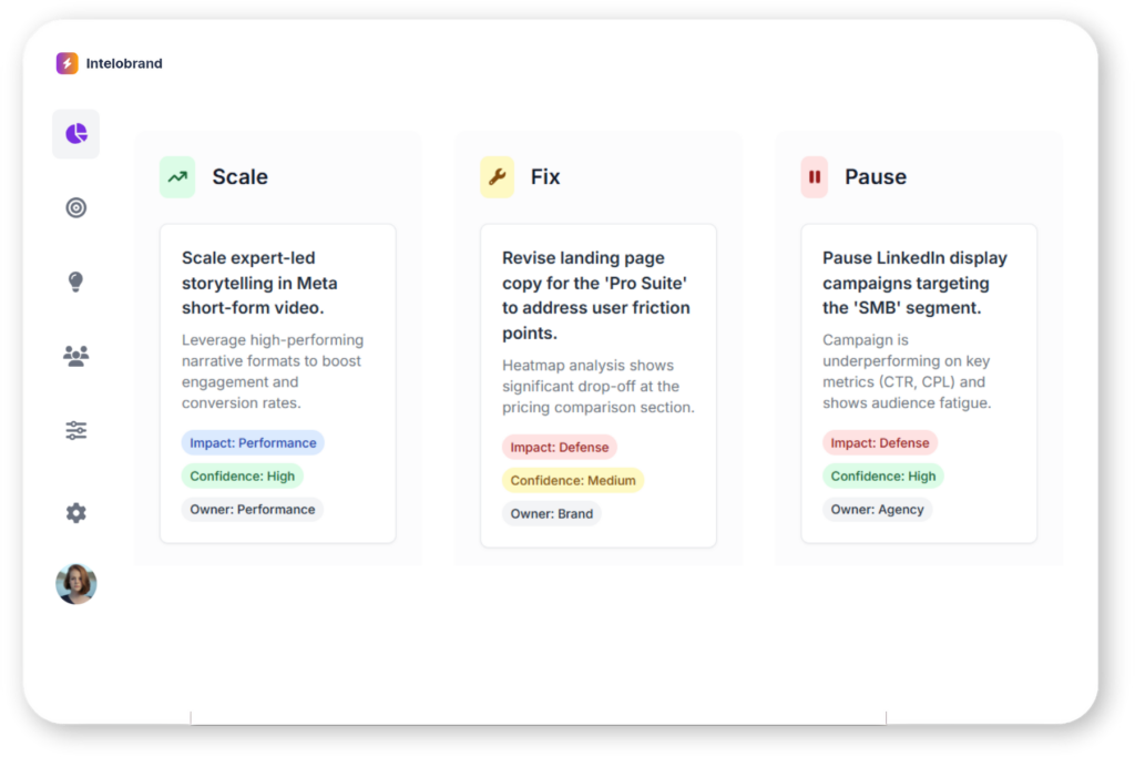 Turns complex data into simple weekly actions: what to scale, what to fix, what to pause and what to test — with clear ownership across brand, media, creative and growth teams.