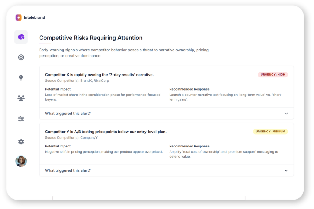 Watches competitors continuously and alerts teams early when market pressure, narrative shifts or creative moves threaten campaign performance or brand position.